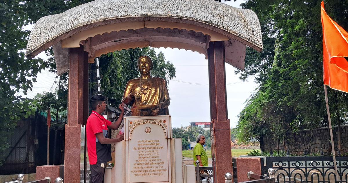 IMAGE: A person removes the paint that was thrown by unidentified persons on the statue of Meenatai Thackeray, wife of the late Bal Thackeray, at Shivaji Park in Mumbai, September 17, 2025. Photograph: Sahil Salvi for Rediff