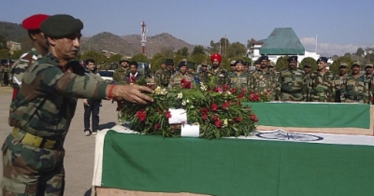 Image: An Indian Army personnel places a wreath on a coffin containing the body of a colleague, who was killed by the Pakistani army in January