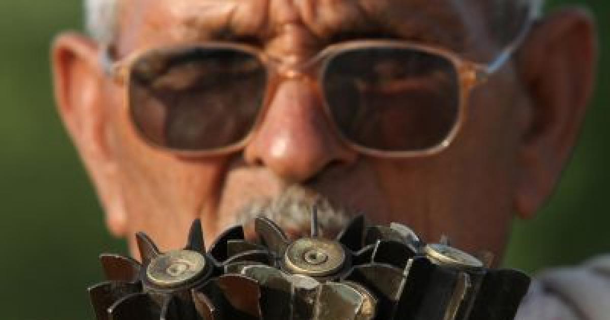 Image: A villager shows mortar shells being fired from the Pakistan side of the international border, in Samba sector.