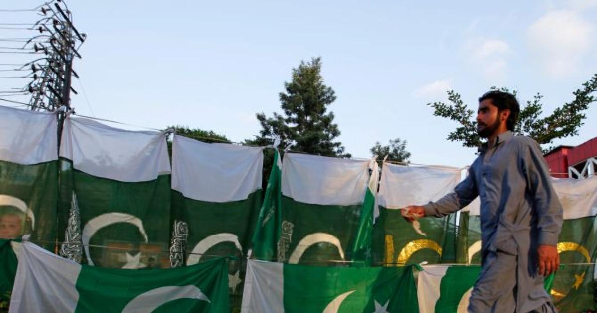 Image: A man walks past a Pakistani flag display along a roadside in Rawalpindi, Pakistan. Photograph: Faisal Mahmood/Reuters