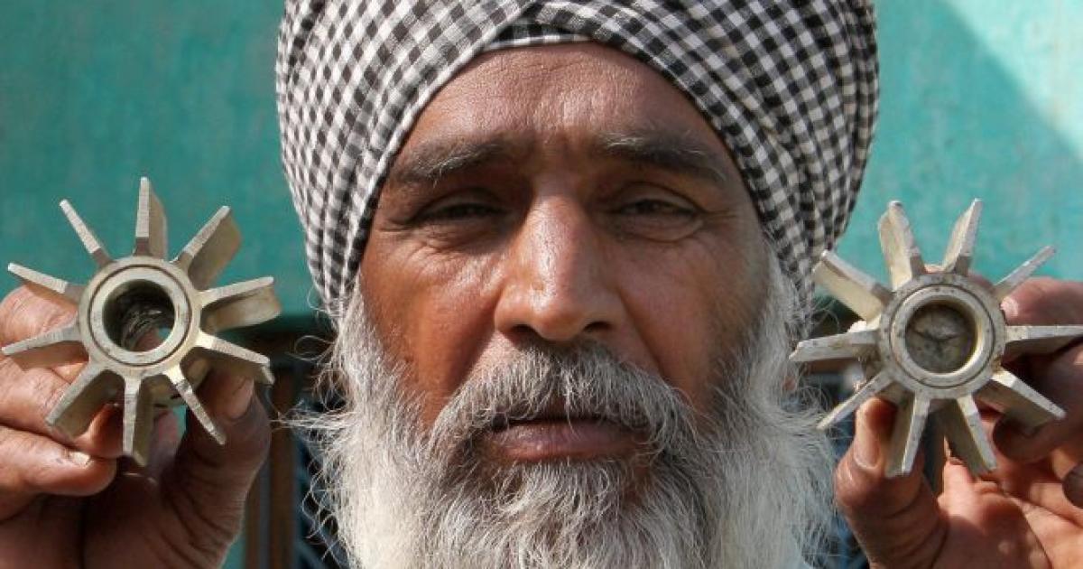 IMAGE: A villager shows parts of mortar shell fired from across the LoC at India-Pakistan International border in Suchetgarh village of RS Pura sector. Photograph: PTI Photo