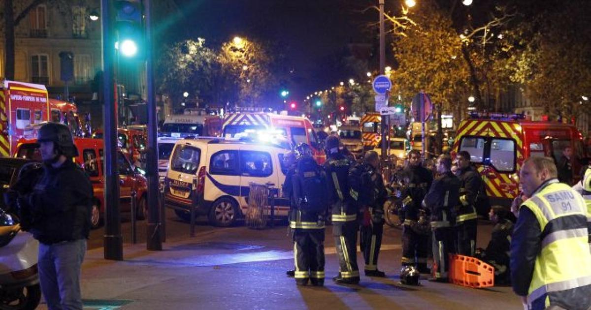 Image: Police and medics gather near the Boulevard des Filles-du-Calvaire after an attack. Gunfire and explosions in multiple locations erupted in the French capital with early casualty reports indicating at least 120 dead. Photograph: Thierry Chesnot/Getty Images
