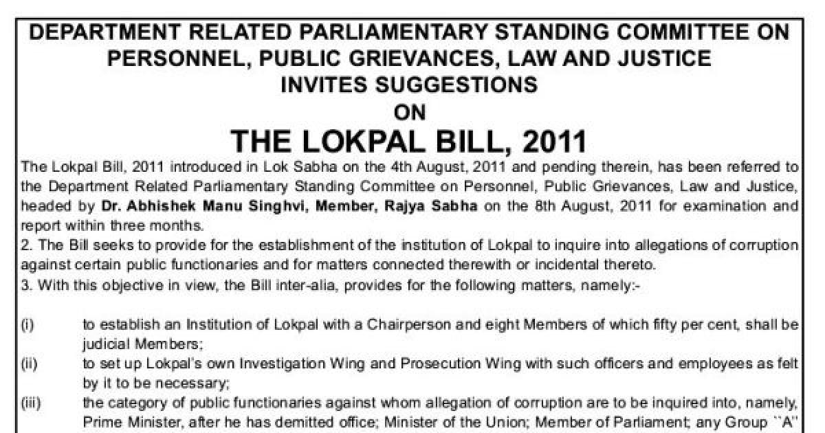 A parliamentary committee has sought public opinion and suggestions on the Lokpal Bill, giving people 15 days to send their feedback on the measure, which proposes to create an anti-corruption watchdog.