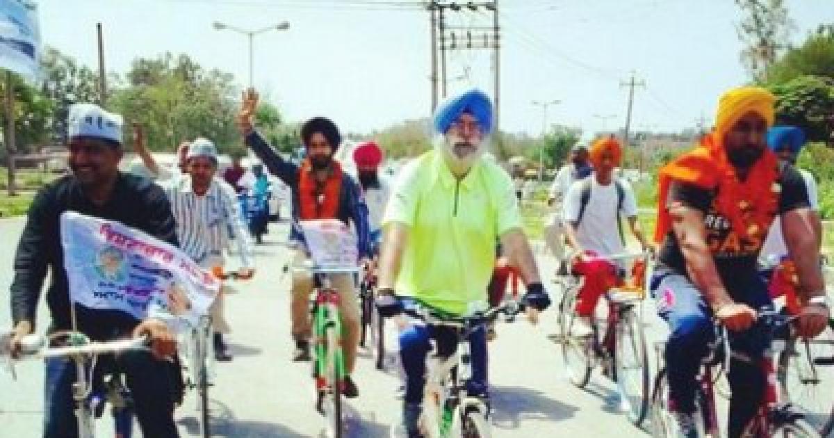 Image: AAP leader H S Phoolka leads a bicycle rally in Punjab.