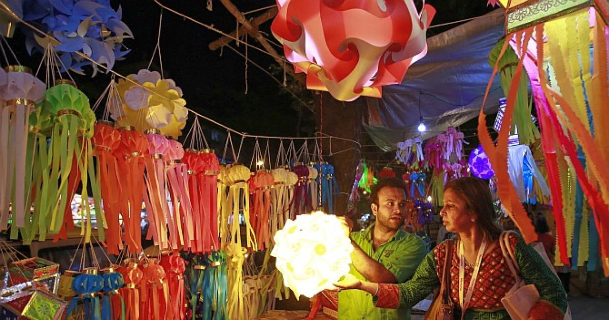 Customers stand under lanterns for sale as they look at them at a Diwali market in Mumbai. Photograph: Danish Siddiqui / Reuters
