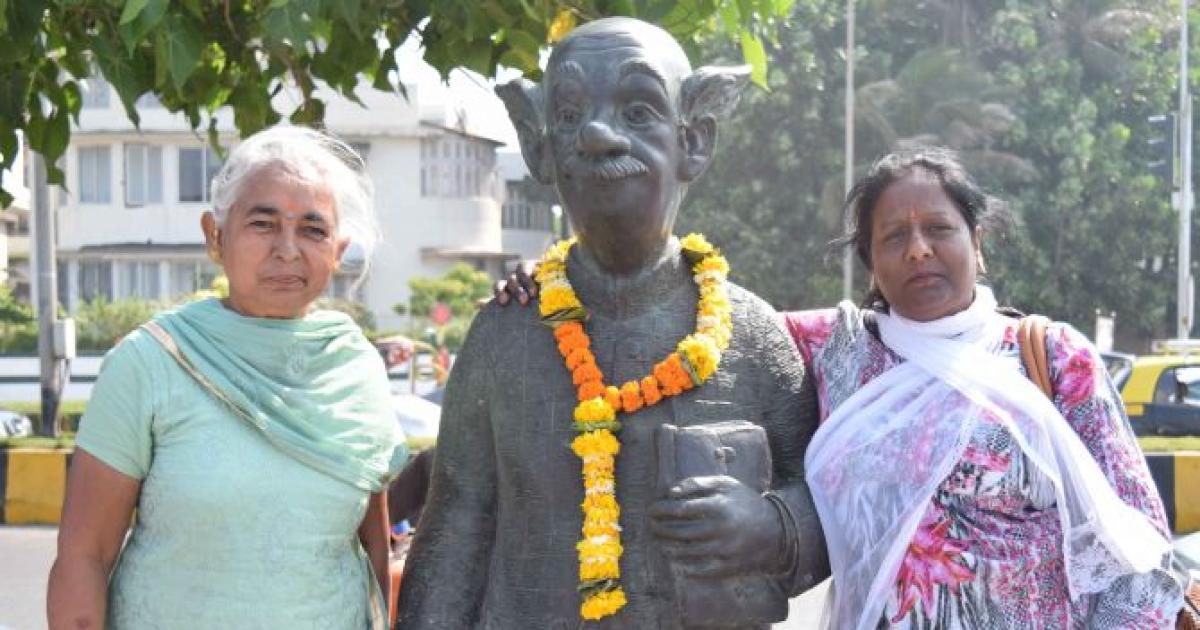 Two women stand by the Common Man statue along the Worli seaface in Mumbai. Photograph: Deepak Salvi