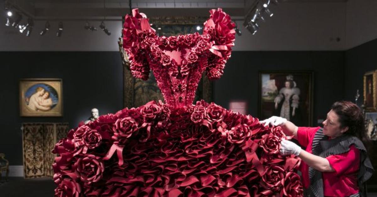 Image: Think you are fashion forward? Wear this red paper dress containing 5,940 ruffles at Sotheby's. Photograph: John Phillips/Getty Images for Sotheby’s