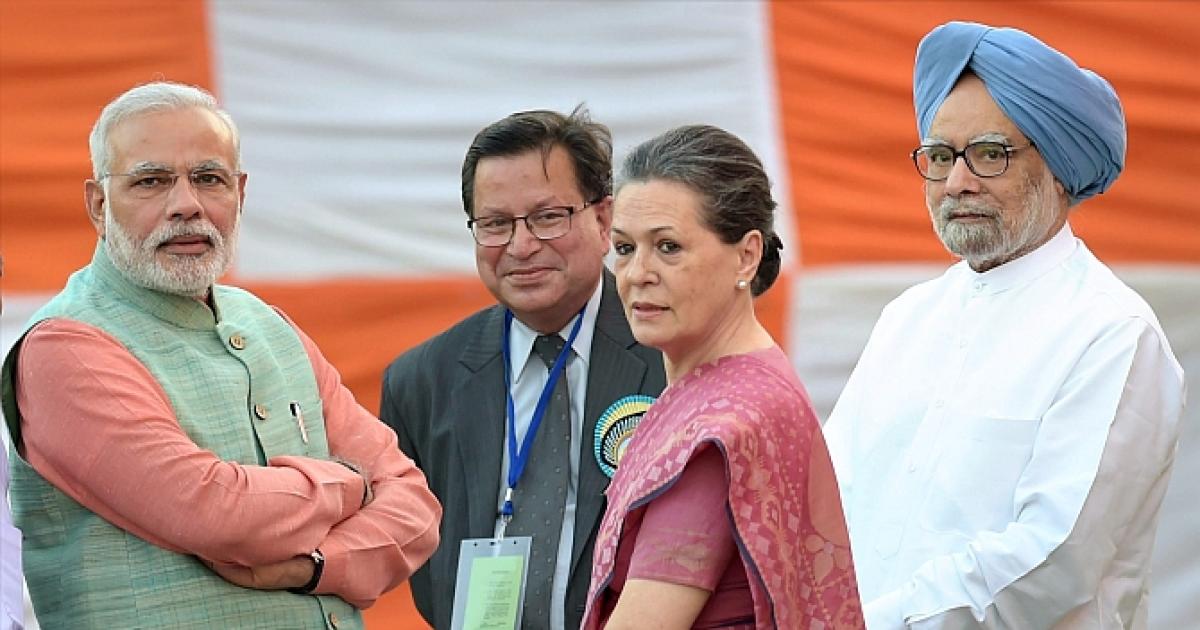 Prime Minister Narendra Modi, with a slight smile, chatted with Congress chief Sonia Gandhi, former PM Manmohan Singh at the Subash Ground in New Delhi, as they gather to celebrate Dussehra. Photograph: PTI