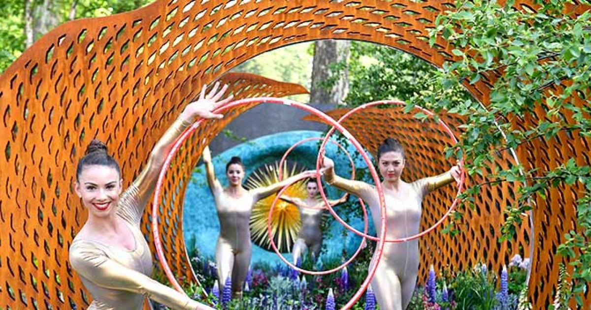 Dancers perform within The David Harber and Savills Garden at the Chelsea Flower Show. According to the RHS website, the metal structure represents a wormhole through time, while the different garden elements illustrate humanity's evolving relationship with the environment. Photograph: Jeff Spicer/Getty Images