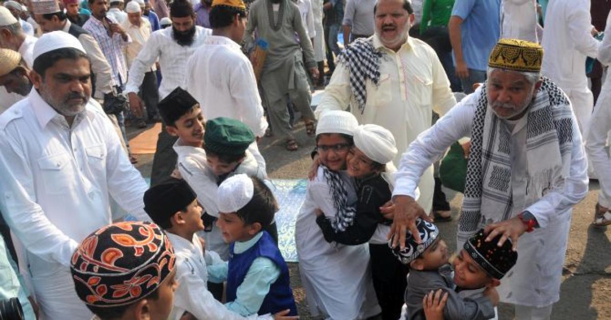 Little boys hug each other to greet them for Eid al-Adha after performing the namaz in Mumbai. Photograph: Arun Patil