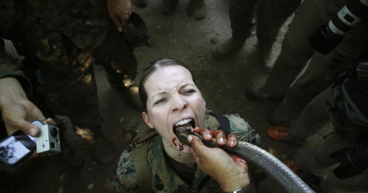 A US marine drinks the blood of a cobra during a jungle survival exercise with the Thai Navy as part of the "Cobra Gold 2013" joint military exercise, at a military base in Chon Buri province, Thailand. Photograph: Damir Sagolj/Reuters