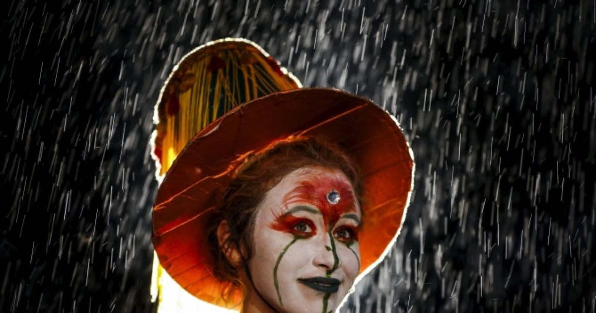 Reveller Jacqueline Fernandez looks on in the rain during the 26th Annual Kensington Market Winter Solstice Parade in Toronto, Canada. Photograph: Mark Blinch/Reuters