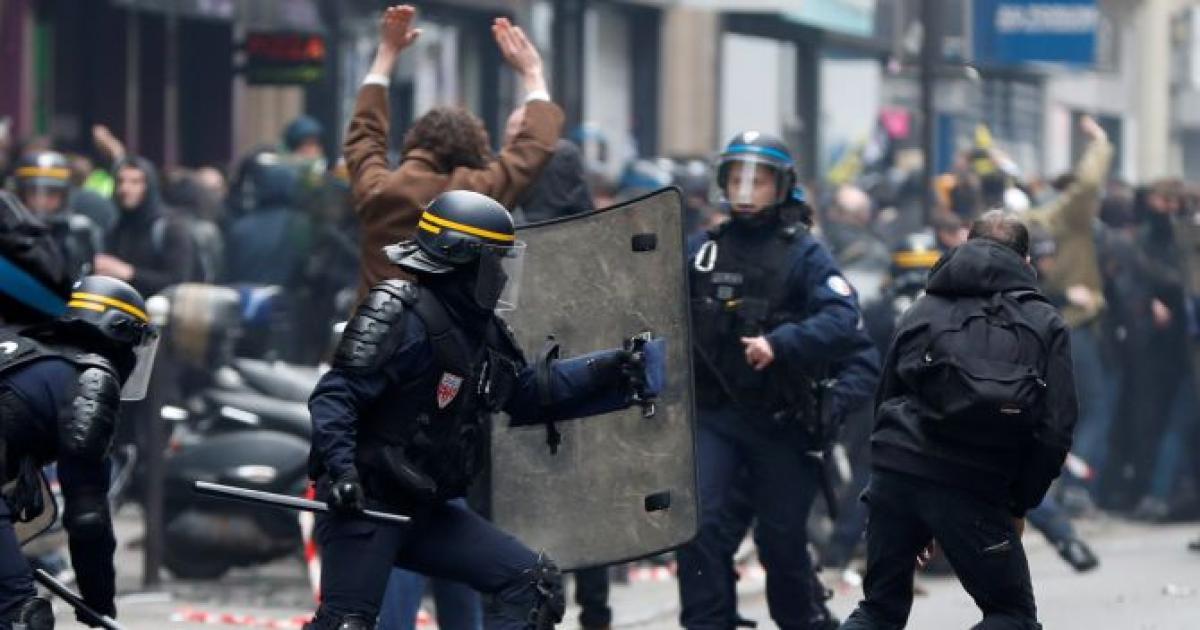 French Compagnies Républicaines de Sécurité (CRS) riot police pursue protesters during a demonstration by French state-owned railway company SNCF workers and students, in Paris, as part of the nationwide strike.