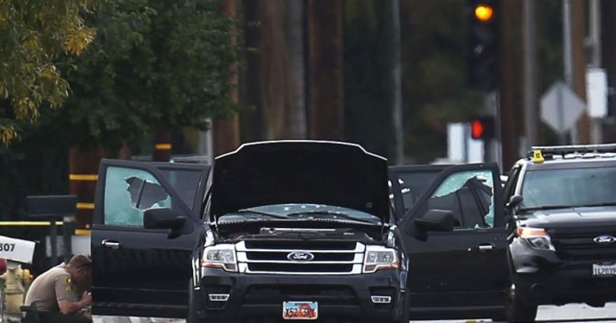 Image: Law enforcement officials investigate around the Ford SUV vehicle that was the scene where suspects of the shooting at the Inland Regional Center were killed on December 3, in San Bernardino, California. Photograph: Joe Raedle/Getty Images