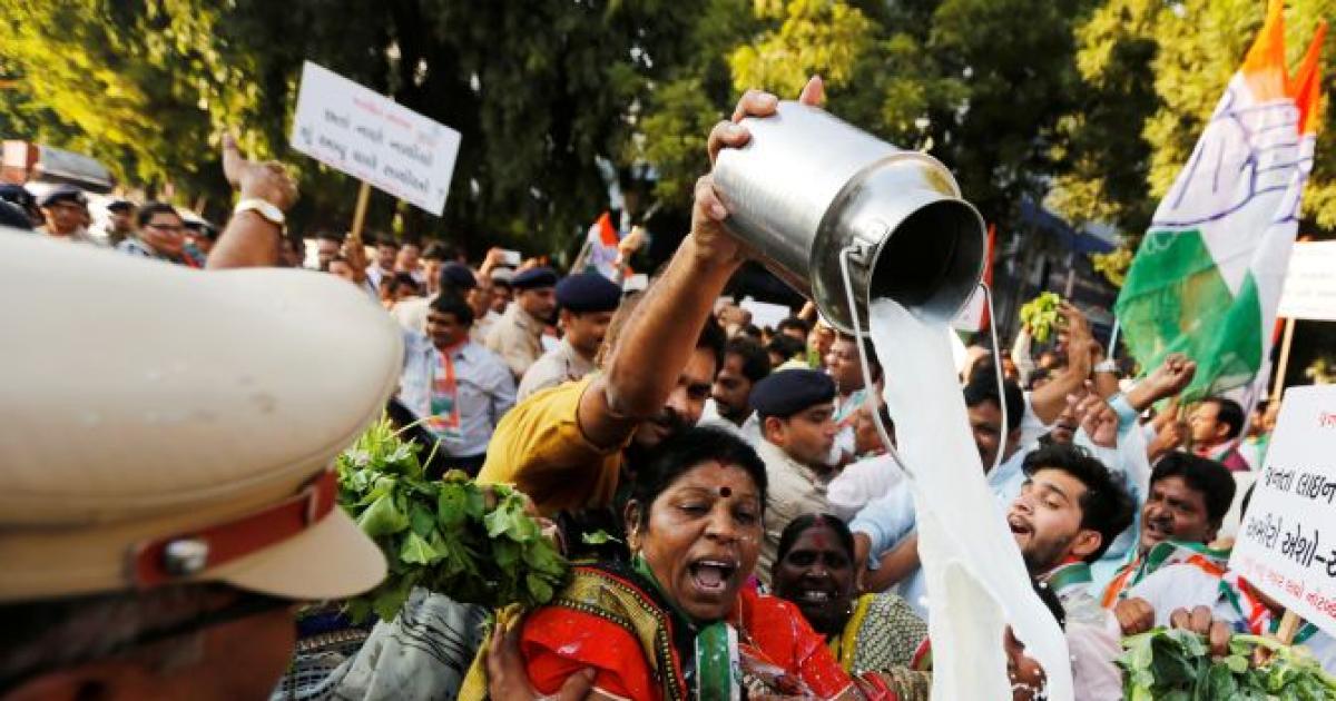 Milk protest: Congress party workers pour milk on a road to protest against the government's decision to withdraw 500 and 1000 rupee banknotes from circulation in Ahmedabad. Photograph: Amit Dave/Reuters