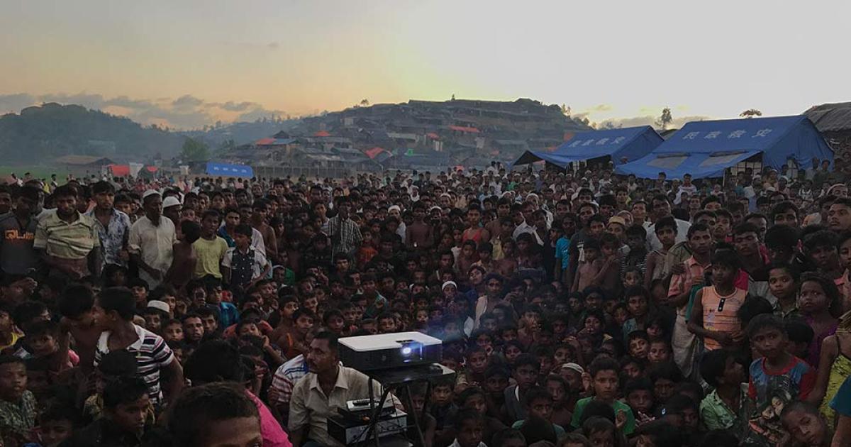 Rohingya children watching an awareness film about health and sanitation near Tangkhali refugee camp in Ukhiya.
