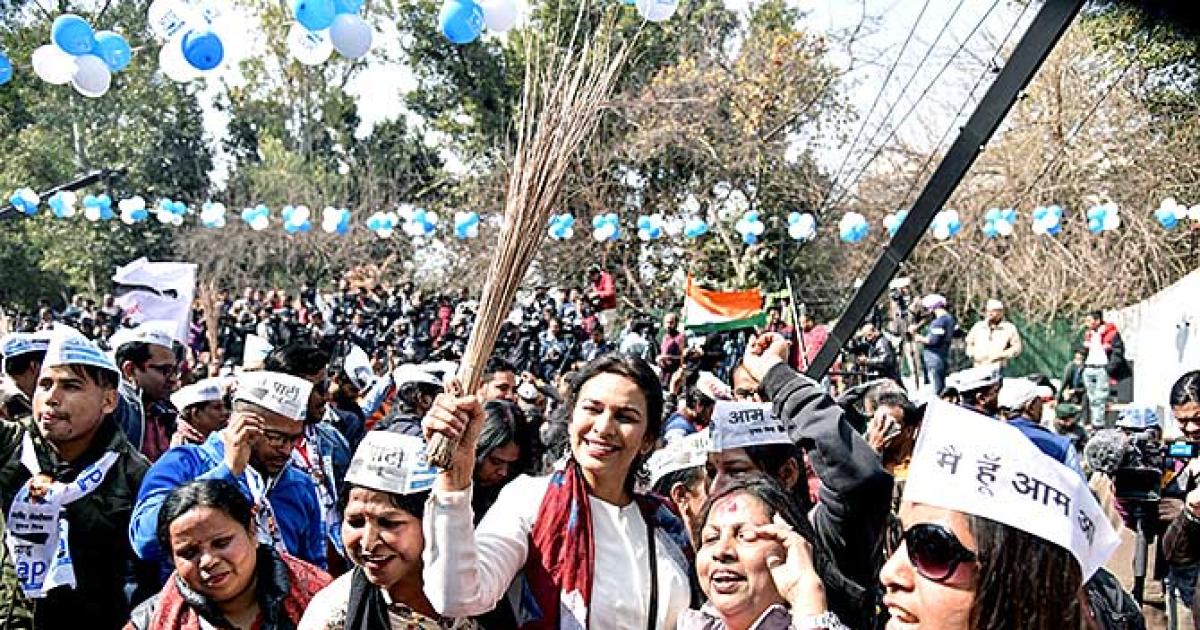 The AAP supporters hold the broom, the party's symbol, while celebrating the party's victory. Photograph: ANI Photo