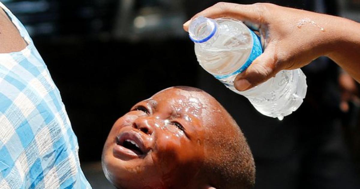 A woman pours water over a child affected by teargas after clashes between police and street vendors in central Harare, Zimbabwe. Photograph: Philimon Bulawayo/Reuters