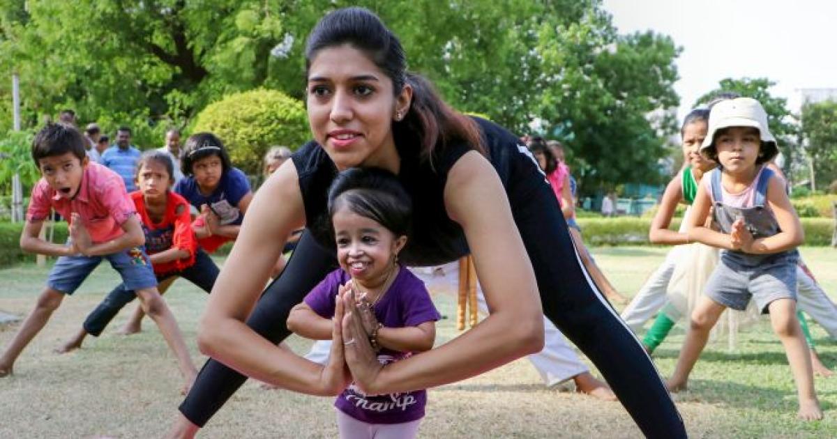 The world's shortest woman Jyoti Amge and Yoga exponent Dhanshri Lekurwale practice ahead of the 5th International Day of Yoga 2019, in Nagpur. Photograph: PTI Photo