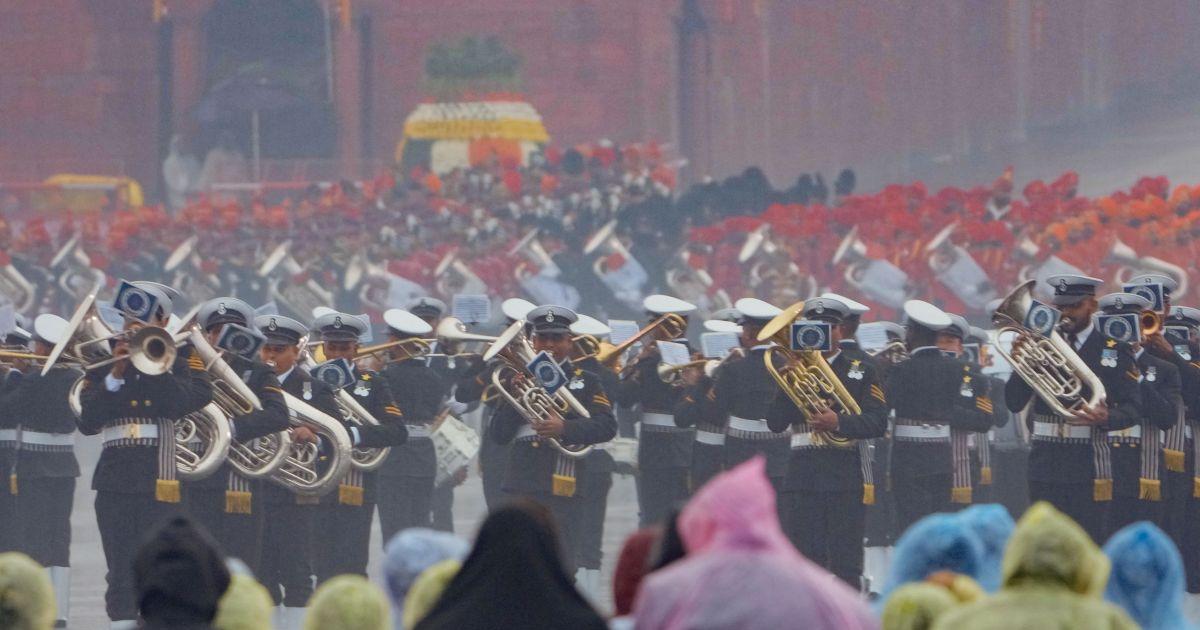 Rains failed to dampen the spirit of Beating Retreat ceremony held at the historic Vijay Chowk in New Delhi on Sunday as Indian classical tunes played by bands of the armed forces filled the air, marking the end of Republic Day celebrations.