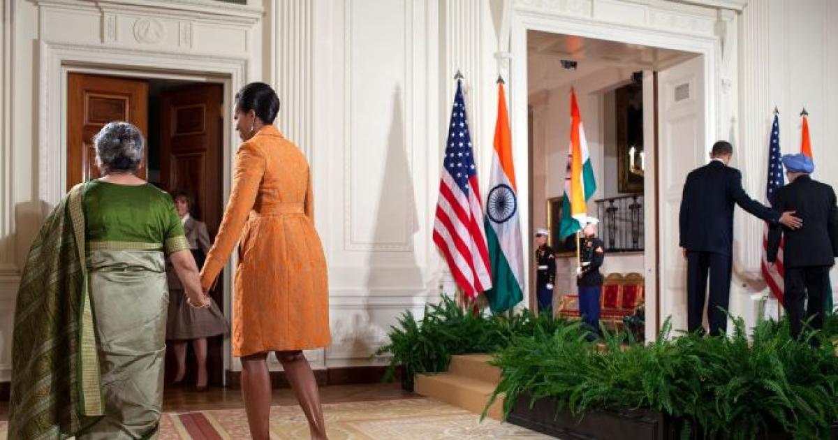 US First Lady Michelle Obama escorts Gursharan Kaur, as President Barack Obama escorts Kaur’s husband, Prime Minister Manmohan Singh of India, at the conclusion of the State Arrival ceremony in the East Room of the White House, November 24, 2009. The Prime Minister’s visit is the first official State Visit hosted by President Obama. Photograph: Pete Souza/Official White House Photo