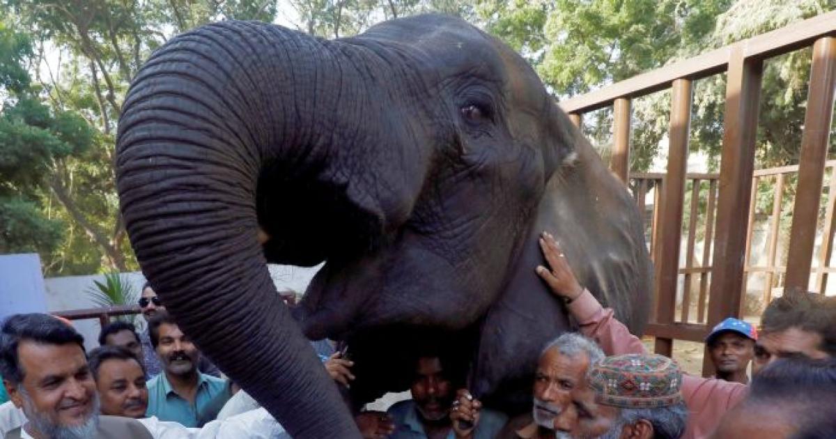 Zoo staff gather as a female elephant named Noor Jahan eats cake on the occassion of her 14th birthday celebration at the Zoological Garden in Karachi, Pakistan. Photograph: Akhtar Soomro/Reuters