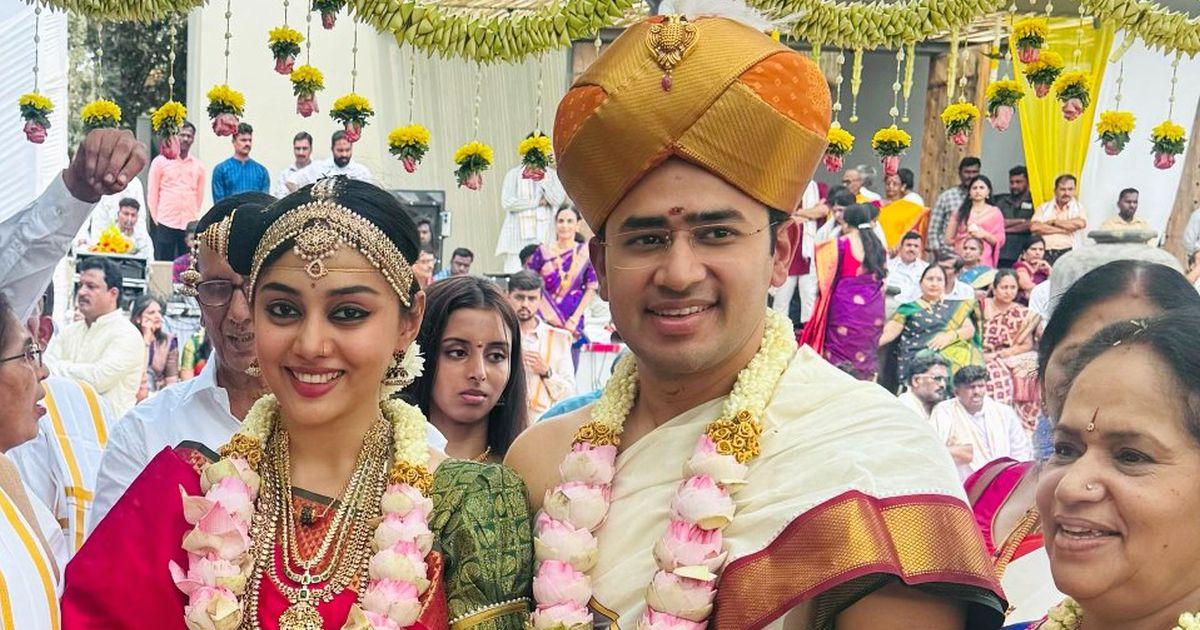 Bharatiya Janata Yuva Morcha national president and Bengaluru South MP Tejasvi Surya tied the knot with Carnatic classical singer Sivasri Skandaprasad in an intimate ceremony in Bengaluru.