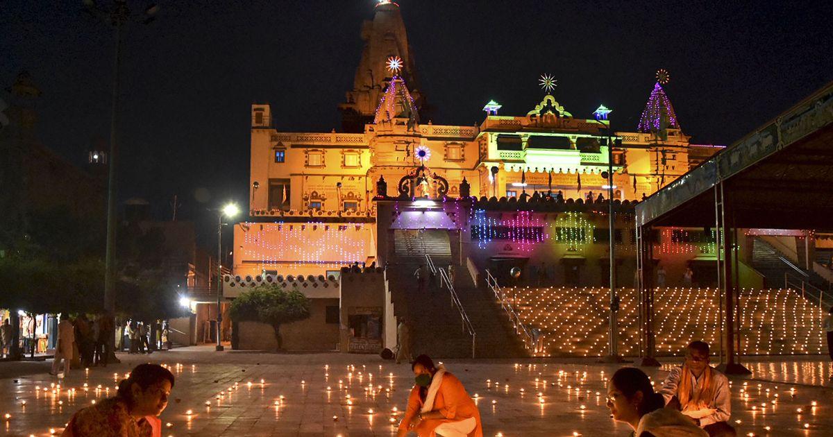 Hindu devotees light earthen lamps at Sri Krishna Janamsthan temple to celebrate the groundbreaking ceremony of the Ayodhya's Ram Temple, in Mathura, on Wednesday. Photograph: PTI Photo