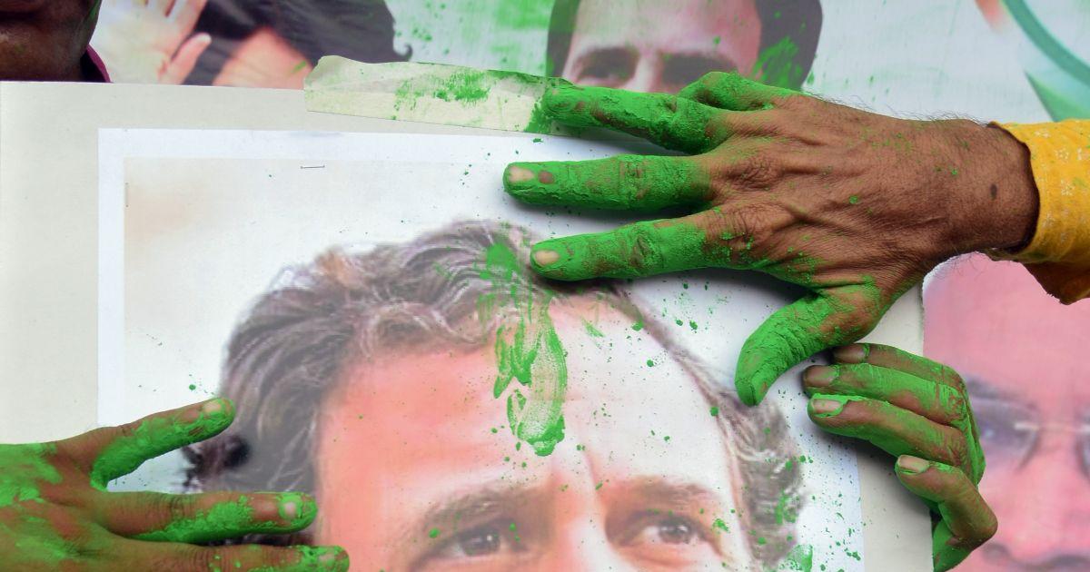 Congress supporters mark a portrait of party leader Rahul Gandhi with colours as they celebrate the party's decisive lead in the Karnataka assembly election results, in Kolkata. Photograph: ANI Photo