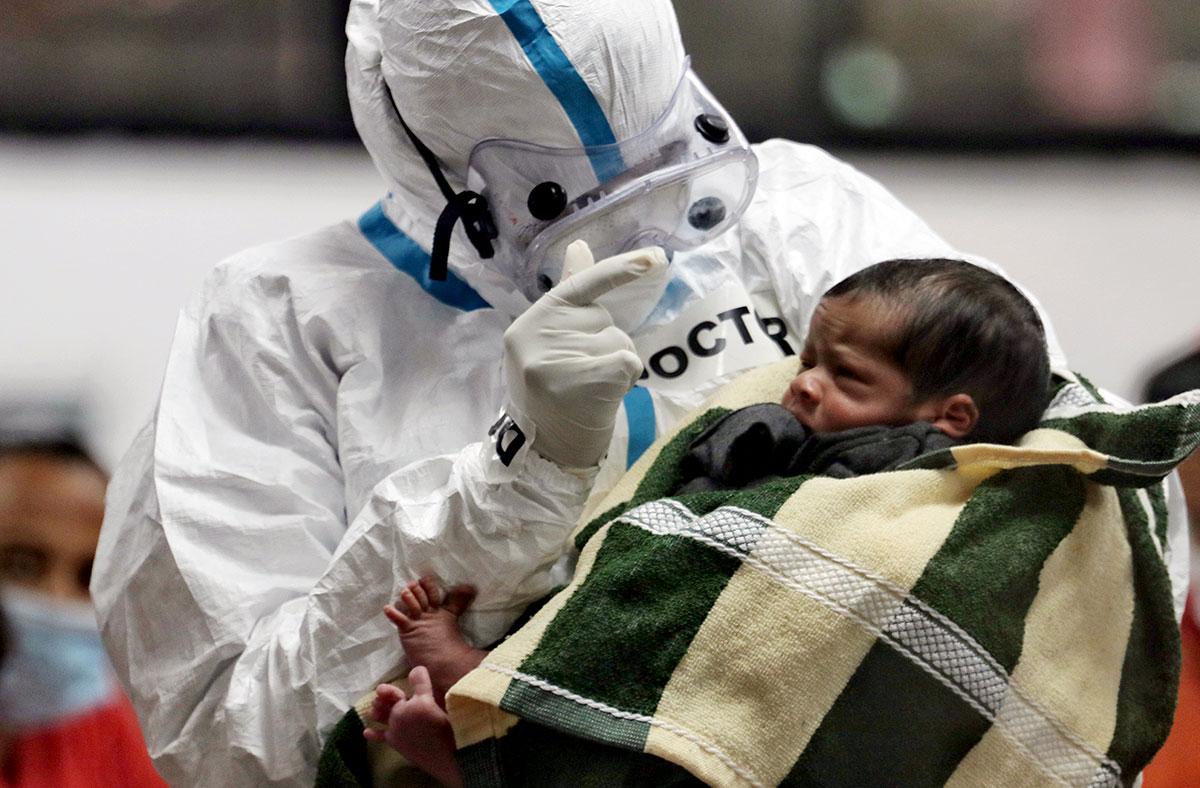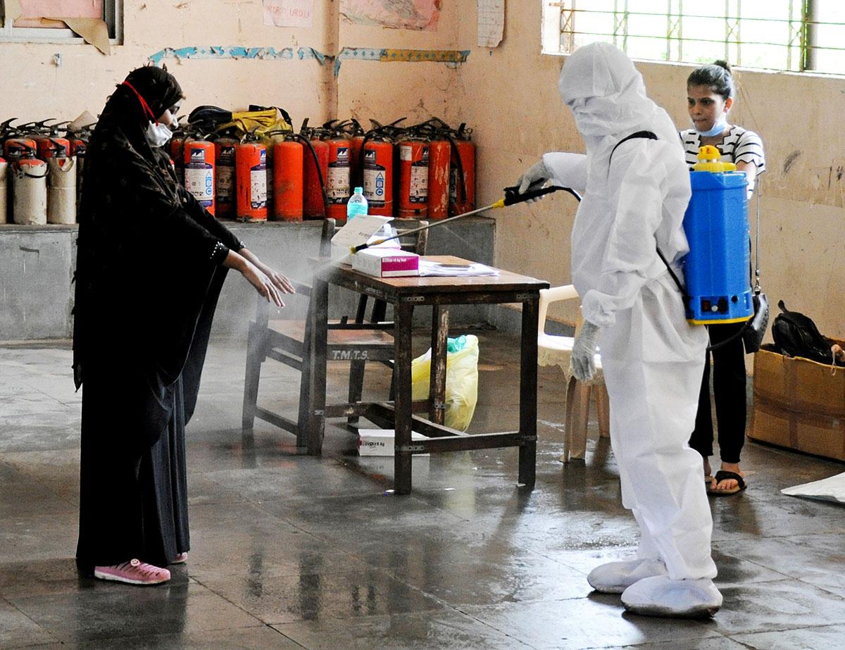 IMAGE: A man wearing protective gear sprays sanitiser on the hand of a woman during COVID-19 test in Mumbai. Photograph: ANI Photo