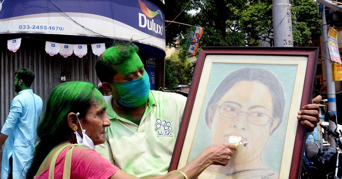 TMC supporters celebrate the victory during the election result day for the West Bengal election, in Kolkata. Photograph: ANI Photos