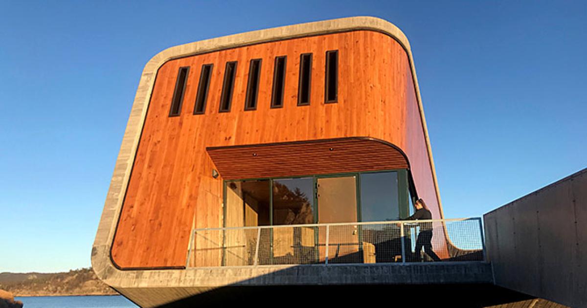Designed by Norwegian outfit Snøhetta, the building is part-sunk into the sea and is encased in a concrete shell designed to withstand the harsh conditions on the seabed of Norway's rugged southern coast.