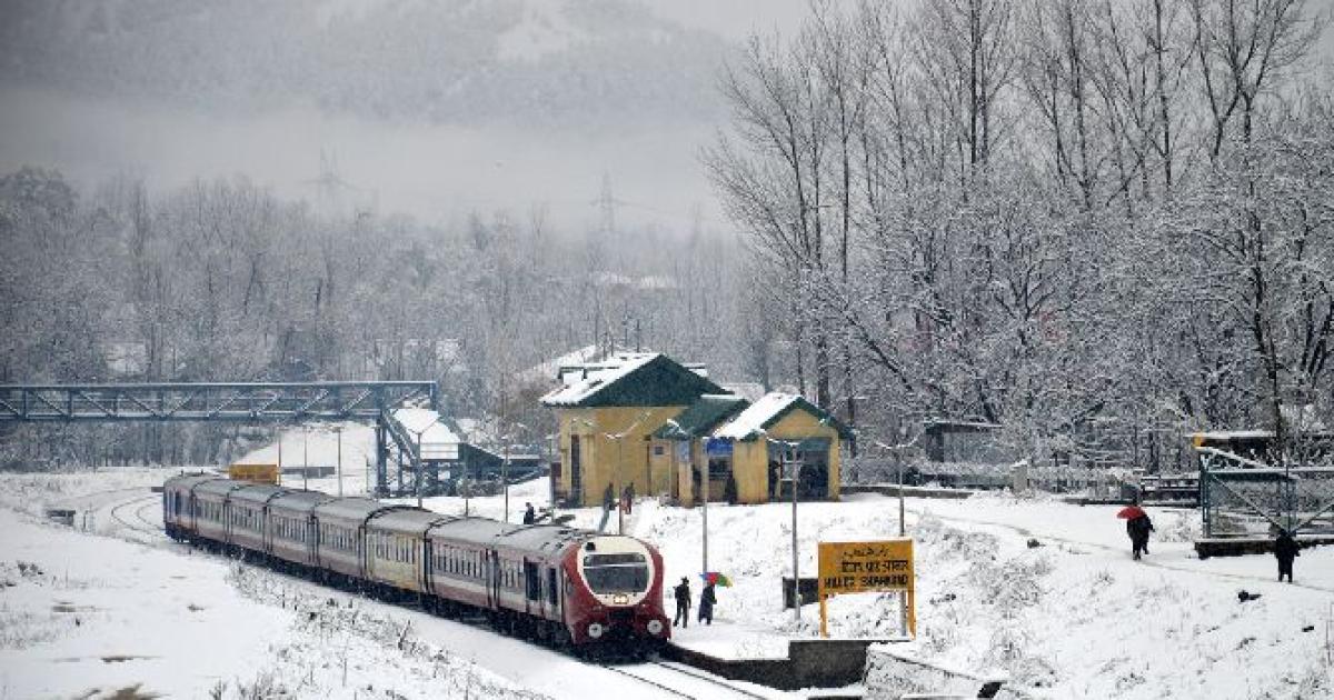 Image: Winter wonderland is here! A train chugs along snowy tracks after the season's first snowfall. Photograph: Umar Ganie/Rediff.com