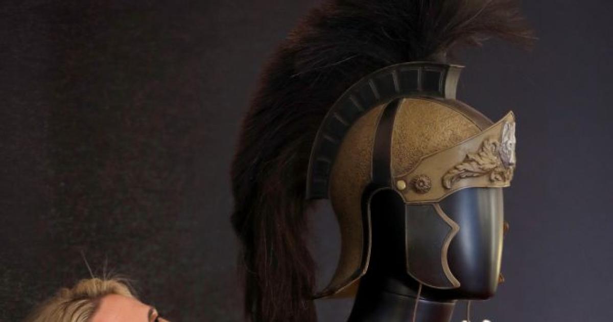 An employee of Prop Store poses for a photograph with Russell Crowe's "Maximus" Roman general armour from the film "Gladiator". The armour is valued at more than $36,000. Photograph: Peter Nicholls/Reuters