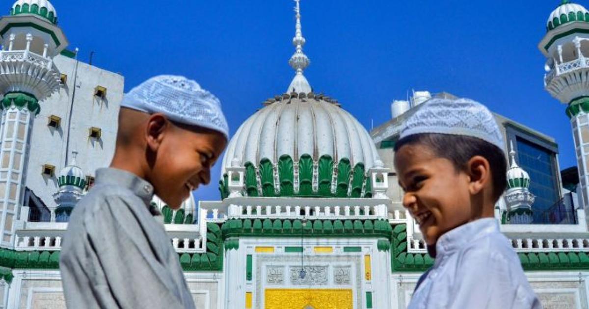 IMAGE: Muslim boys greet each other after offering Eid prayers at historical Khairudeen Jama Masjid during ongoing COVID-19 lockdown, in Amritsar, on Monday. Photograph: PTI Photo