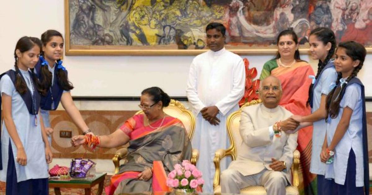 Students and children of various schools and organisations tie rakhis on the wrist of President Ram Nath Kovind at Rashtrapati Bhavan. Photograph: Kind courtesy @rashtrapatibhvn/Twitter
