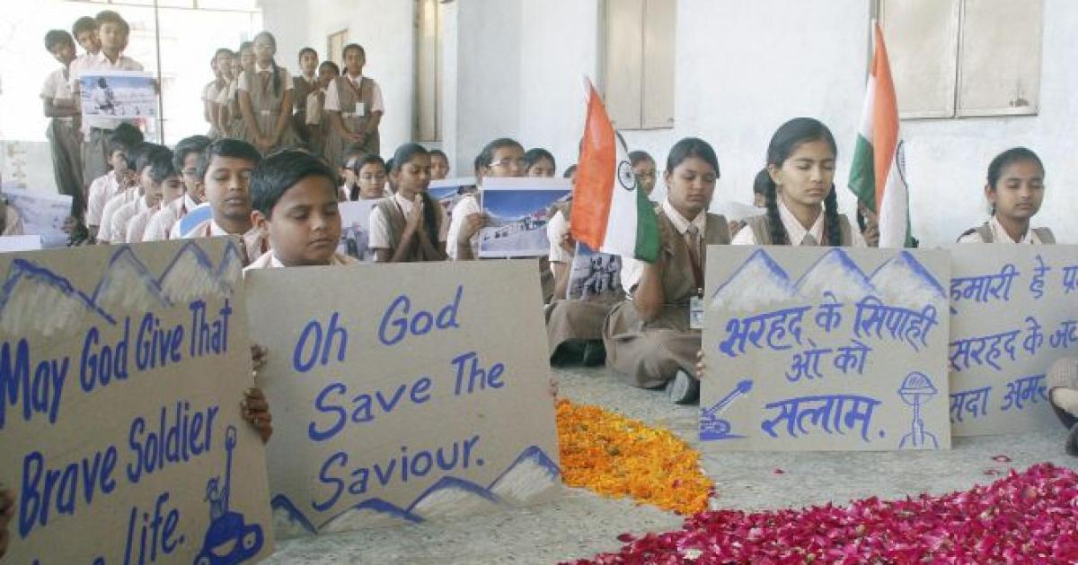 School students pay tributes to the Siachen avalanche martyrs in Ahmedabad. Photograph: PTI