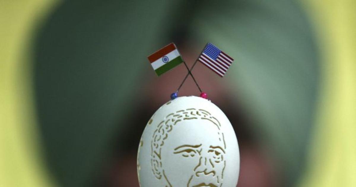 Indian artist Harwinder Singh Gill displays his creation, an image of US President Barack Obama carved on a duck’s egg shell, with the national flags of India and United States, ahead of Obama’s visit to India. Photograph: Munish Sharma/Reuters