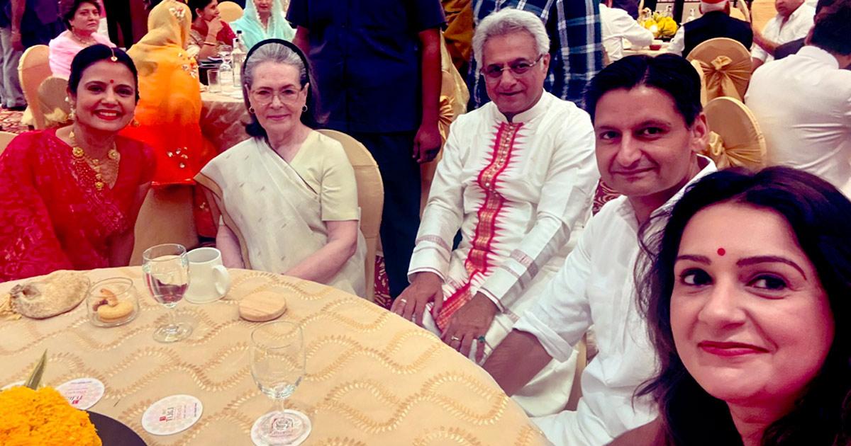 Congress leaders Sonia Gandhi and Deepinder Singh Hooda, Shiv Sena-UBT MP Priyanka Chaturvedi attended the reception at Hotel Lalit. Photograph: @priyankac19/X