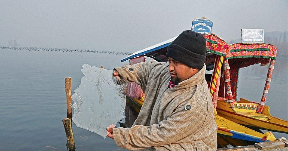 Image: (Above) A boatman shows a piece of frozen surface of Dal Lake on a cold morning in Srinagar. Photograph: S Irfan/PTI Photo. (Below) A man pushes his handcart through a snow-covered street. Photograph: Danish Ismail/Reuters