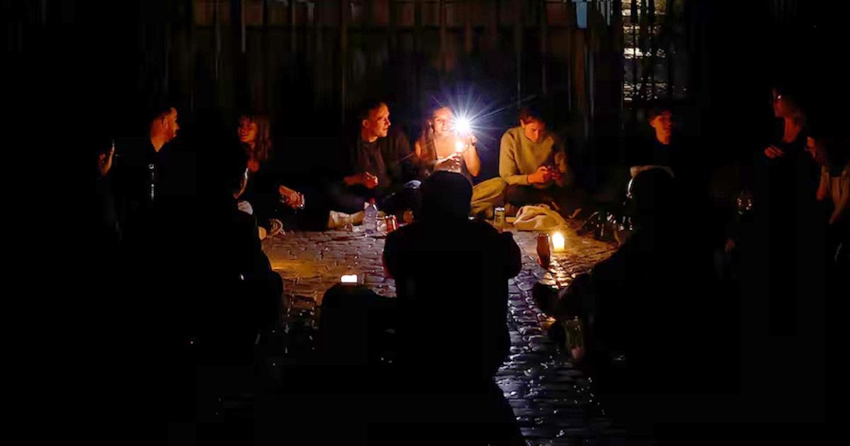 IMAGE: People sit in candlelight and use mobile phone flashlights in the dark during a nationwide power outage at Plaza Mayor square in Madrid, Spain, April 28. Photograph: Susana Vera/Reuters