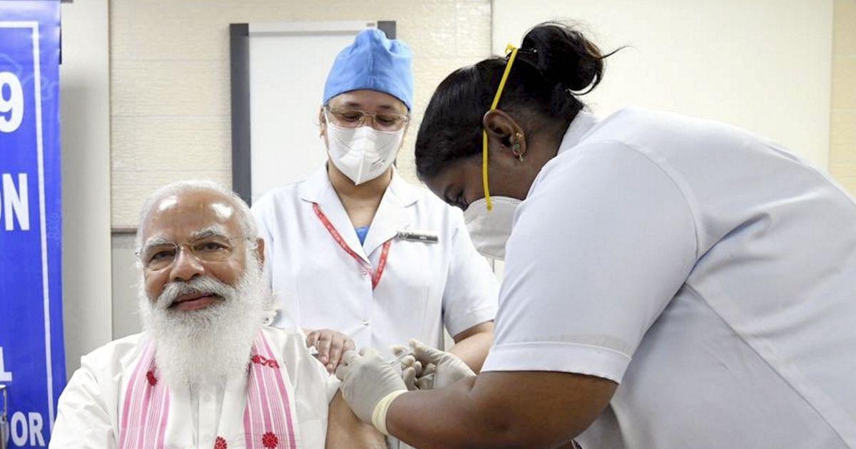 Prime Minister Narendra Modi is administered a COVID-19 vaccine in New Delhi. Photograph: PTI Photo
