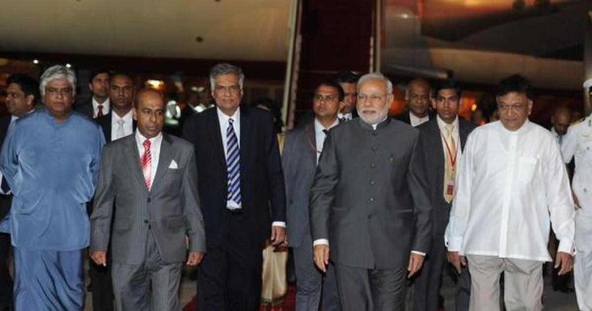 Modi was received by Sri Lankan Prime Minister Ranil Wickramasinghe at the airport after he arrived in Colombo for a two-day visit at 5.25 am. following an overnight journey from Port Louis in Mauritius in a special Air India plane.
