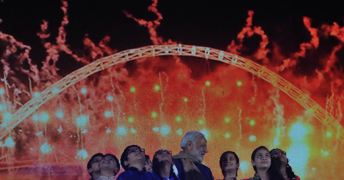 Ending on a bang: PM Modi along with kids are mesmerised by the colourful and beautiful firework display at the Wembley arena after the PM's speech to the Indian diaspora. Organisers of the show said that the display was UK's biggest. Photograph: MEA/Flickr
