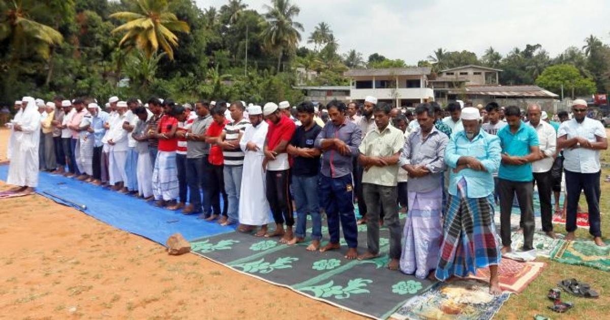 IMAGE: Muslim men pray at a ground in Digana central district of Kandy, Sri Lanka. Photograph: Dinuka Liyanawatte/Reuters