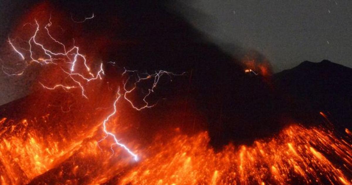 Image: Volcanic lightning seen at the eruption of Mount Sakurajima. Photograph: Kyodo/Reuters
