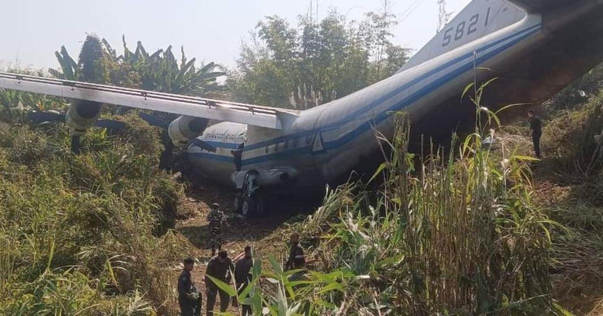 Officials said the Myanmar air force Y-8 cargo plane overshot the tabletop runway of the Mizoram government-run airport around 10.20 am and crash-landed into a nearby bush, splitting the bottom of the fuselage.