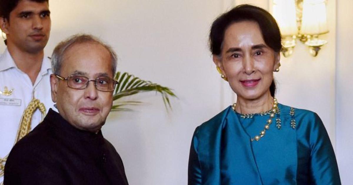 President Pranab Mukherjee with Myanmar’s State Counselor and Foreign Minister Aung San Suu Kyi at Rashtrapati Bhavan. Photograph: Subhav Shukla/PTI