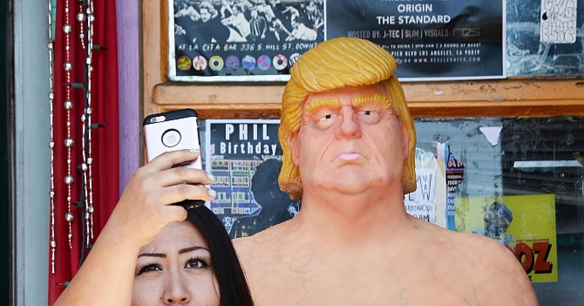 Amused and surprised passers-by flocked to take pictures with the statue showing a stern-faced Trump with trademark flock of bright yellow hair and hands folded over a bulging belly.