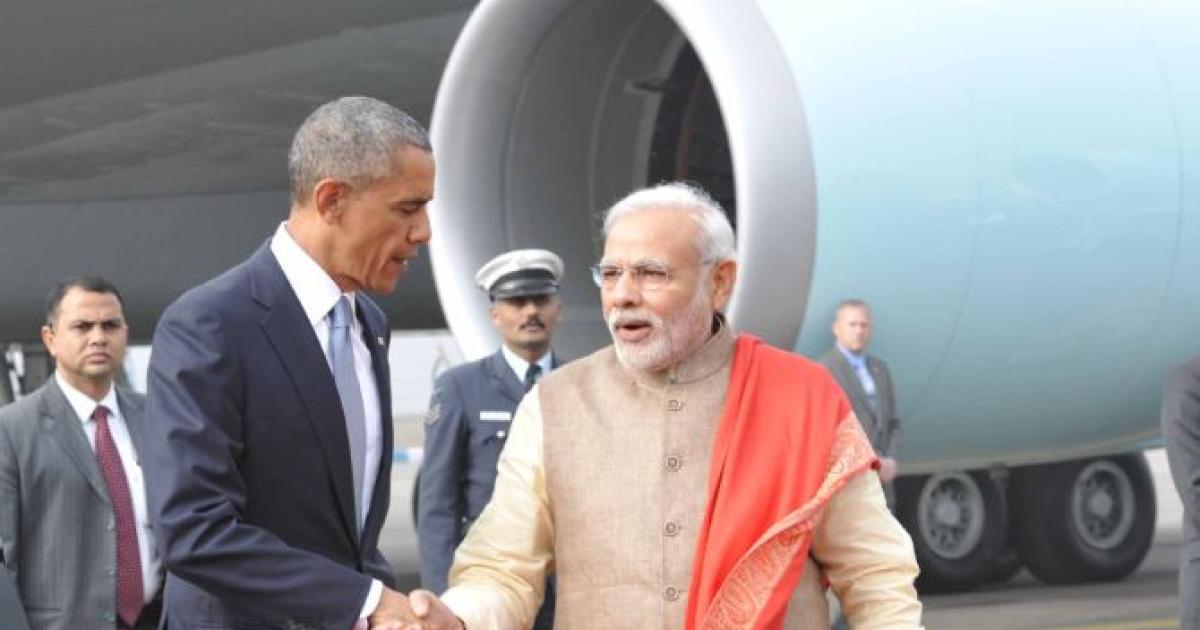 While Modi sported a vibrant attire with a red and gold stole, Obama was attired in a more business-like dark suit. His wife Michelle was in a flowing blue and black dress.
